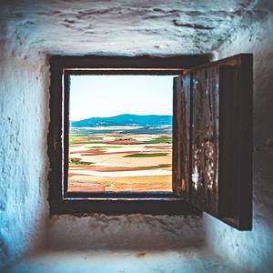 View of Consuegra Spain farmland through the window of the famous windmills.